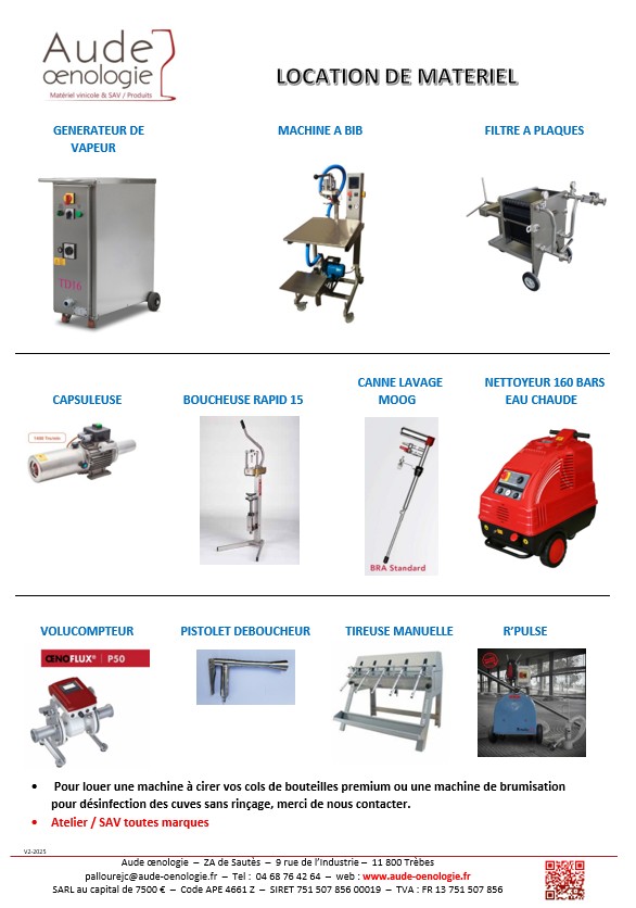Matériels oenologiques disponibles à Carcassonne chez Aude Oenologie. Location à la journée ou à la demande.